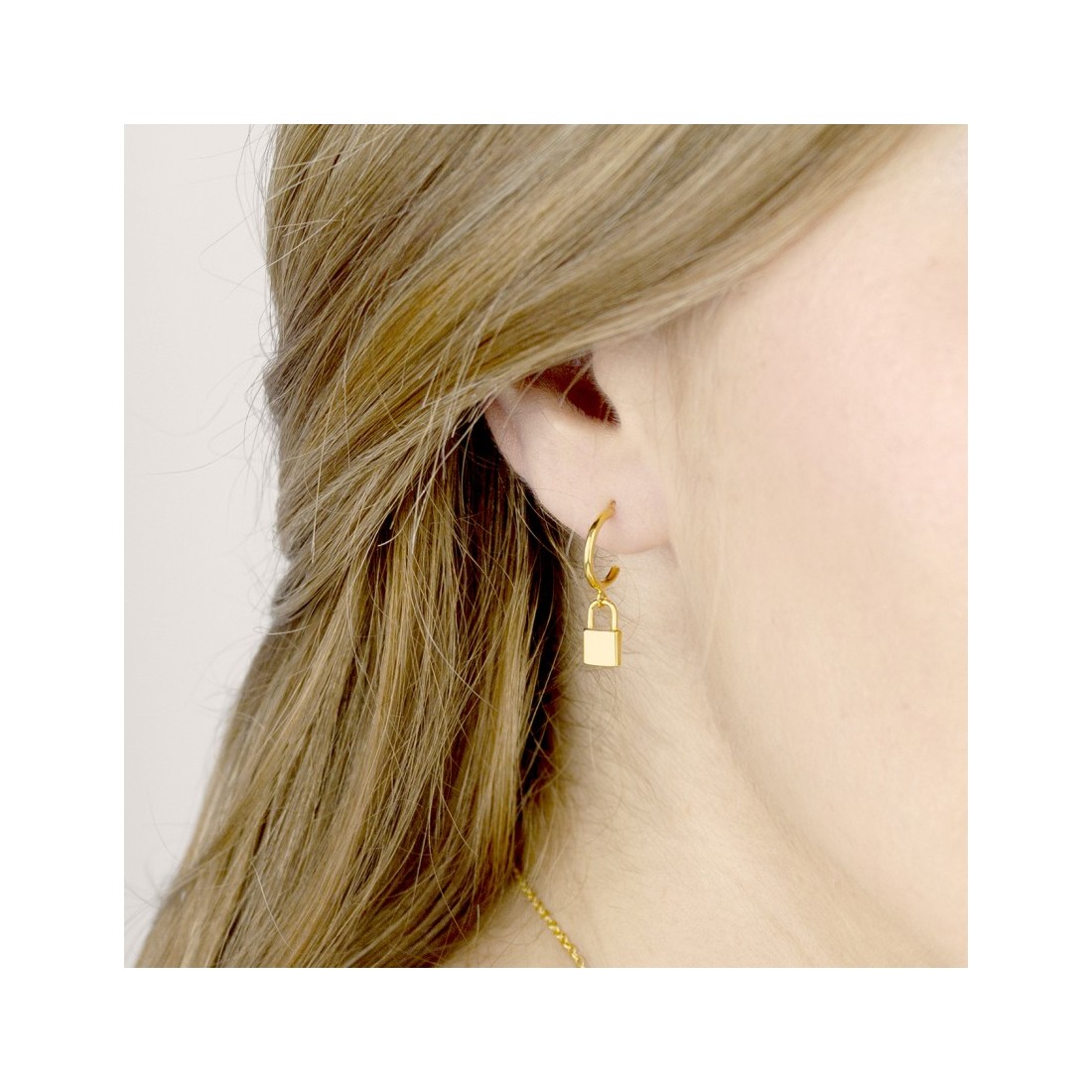 11 mm diameter Golden plated Sterling Silver hoop earrings with snap clasp and a small padlock hanging from them.