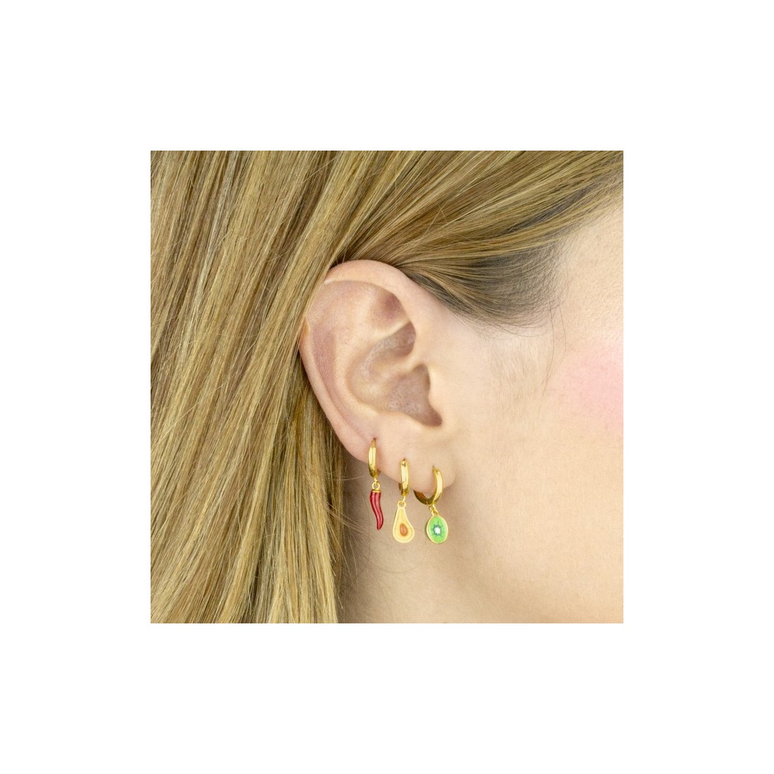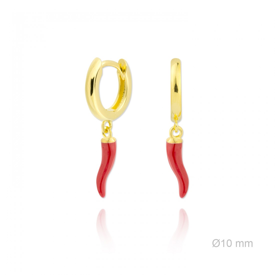 10 mm diameter Golden plated Sterling Silver hoop earrings from which hang an enamel chilli.