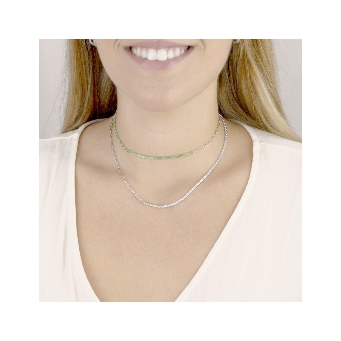 Sterling Silver necklace with long links and emerald zircons.