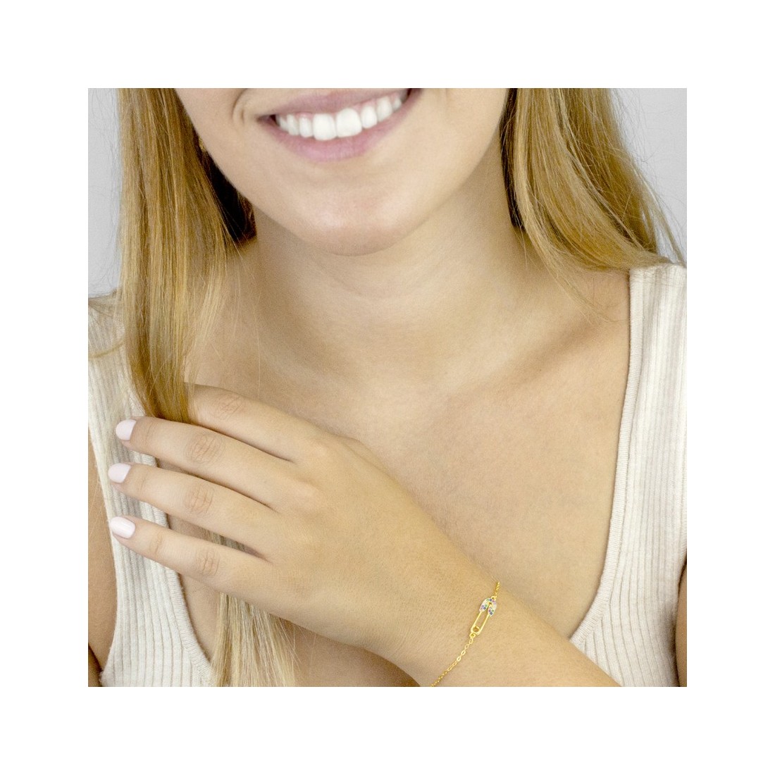 Golden plated Sterling Silver bracelet with 17 mm safety pin bead and color zircons.