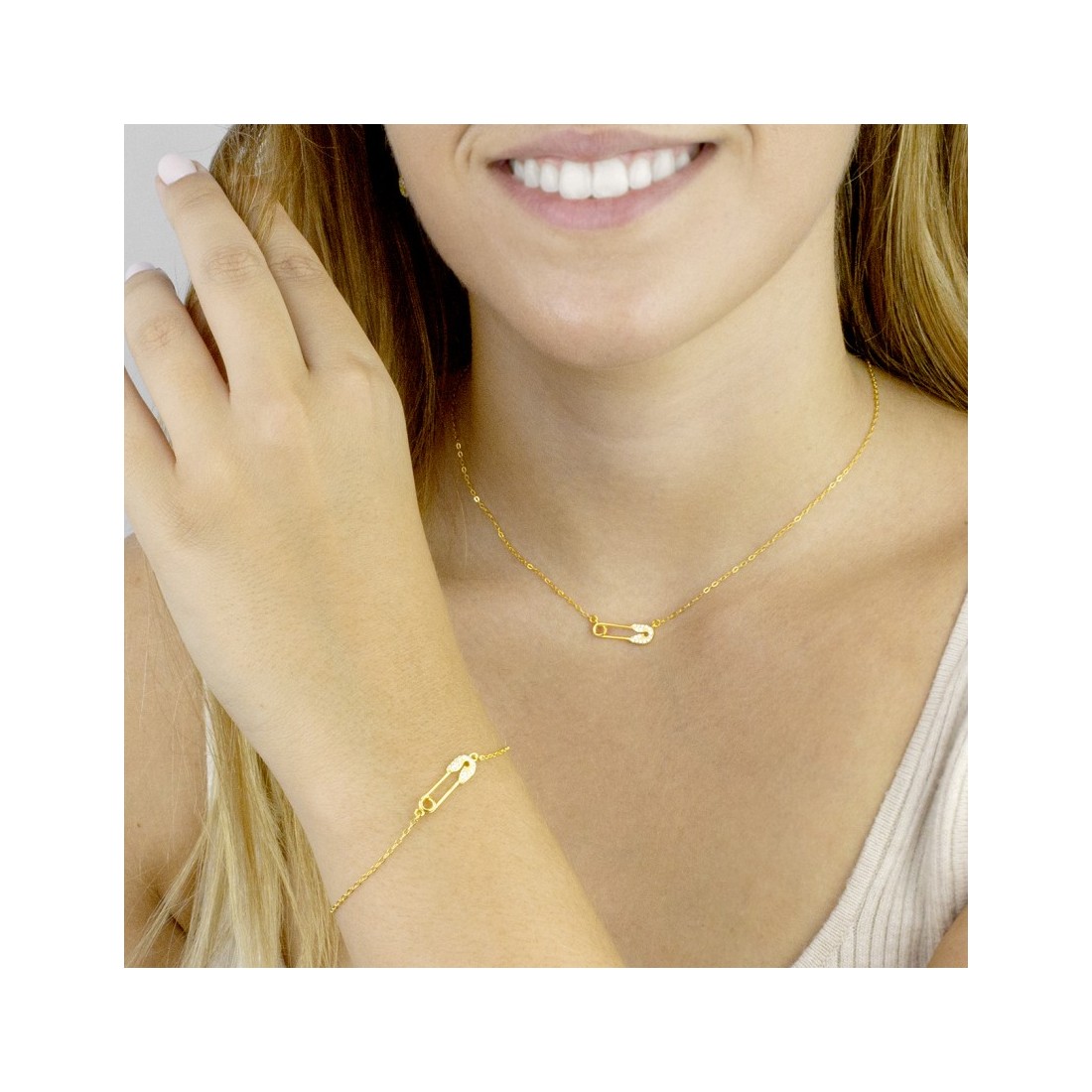 Golden plated Sterling Silver necklace from which hangs a 18 mm small safety bead with white zircons.Length 38 cm plus 5 cm extension chain.Includes packaging.