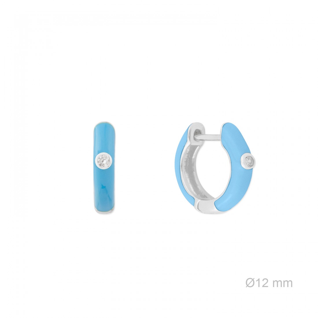 12 mm diameter Sterling Silver hoop earrings with blue enamel and white zircon.