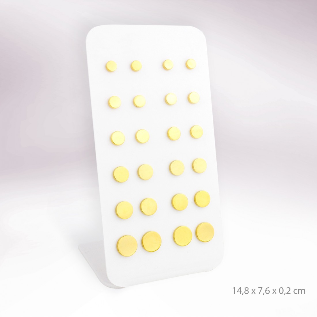 Resin display with 12 pairs of Stainless steel earrings in gold color.