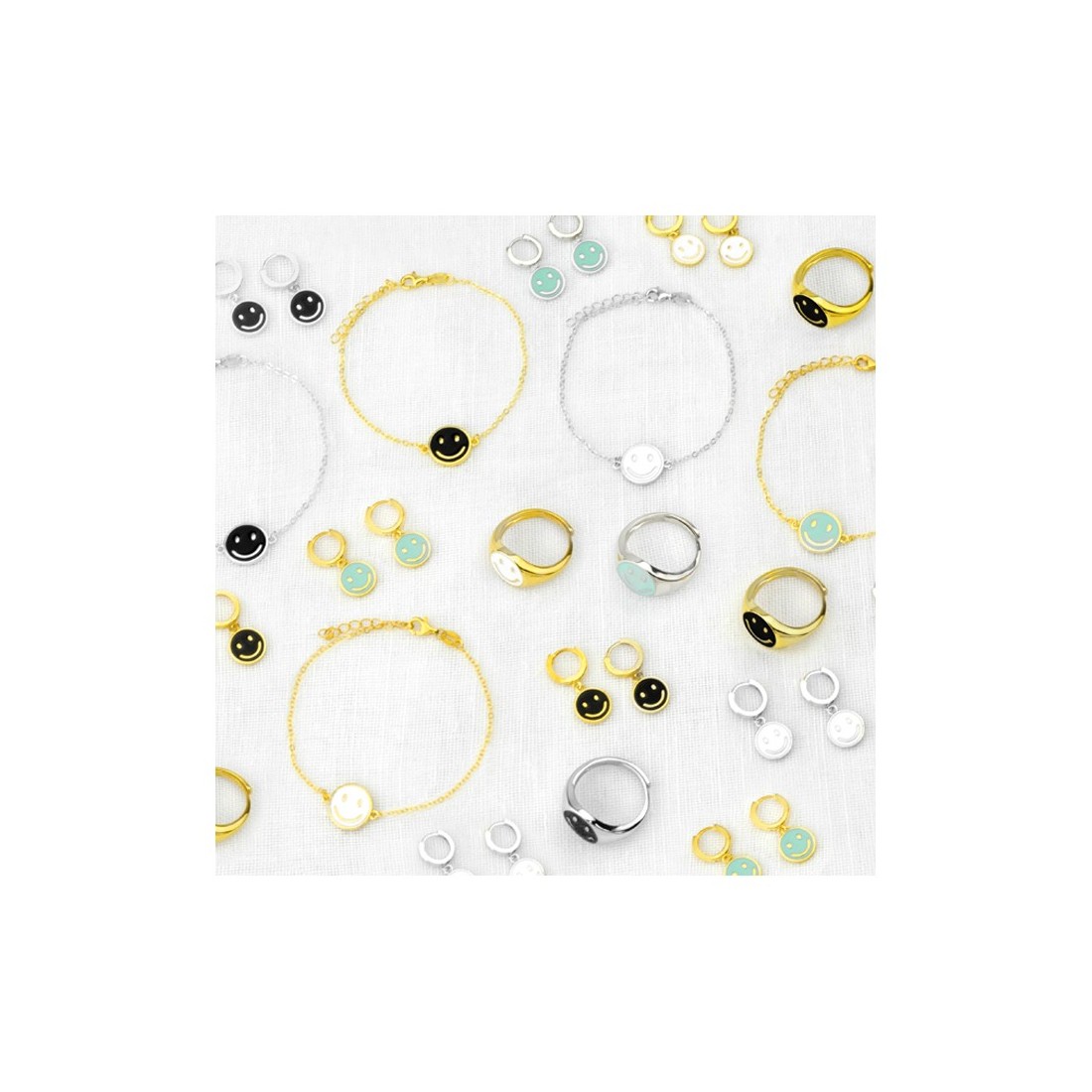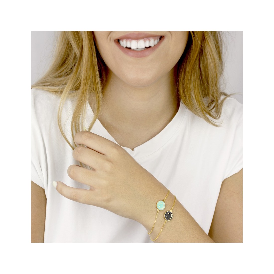 Golden plated Sterling Silver bracelet with 14 mm diameter black enamel smiley bead.