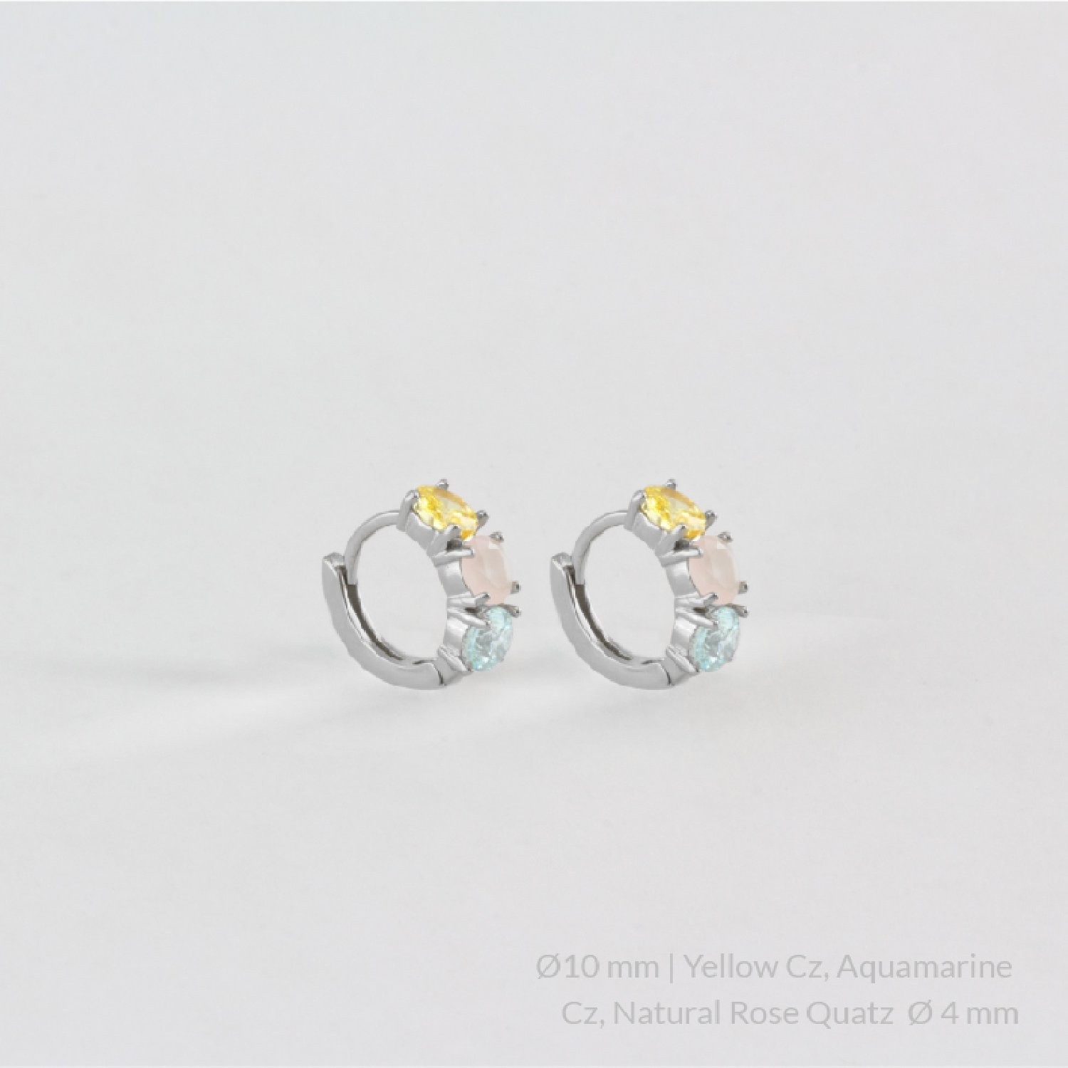 Tamaño de las piedras: Ø4.00 mm aprox.| Color de las circonitas: amarillo y aguamarina | Color del cuarzo: rosa.