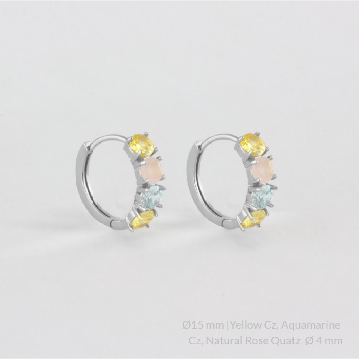 Tamaño de las piedras: Ø4.00 mm aprox.| Color de las circonitas: amarillo y aguamarina | Color del cuarzo: rosa.