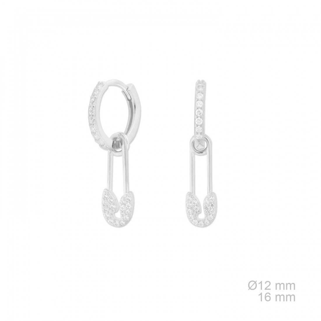 Aros de Plata de Ley de 12 mm de diámetro de los que cuelga un pequeño imperdible con circonitas blancas.