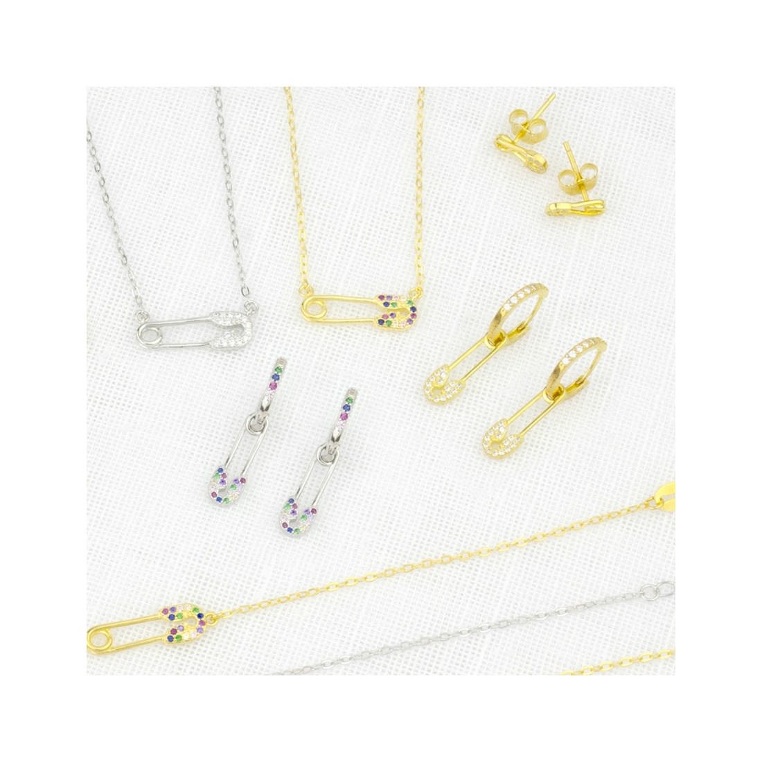 Pendientes de Plata de Ley chapados en oro de 10 mm con un pequeño imperdible con circonitas blancas.Incluye caja.