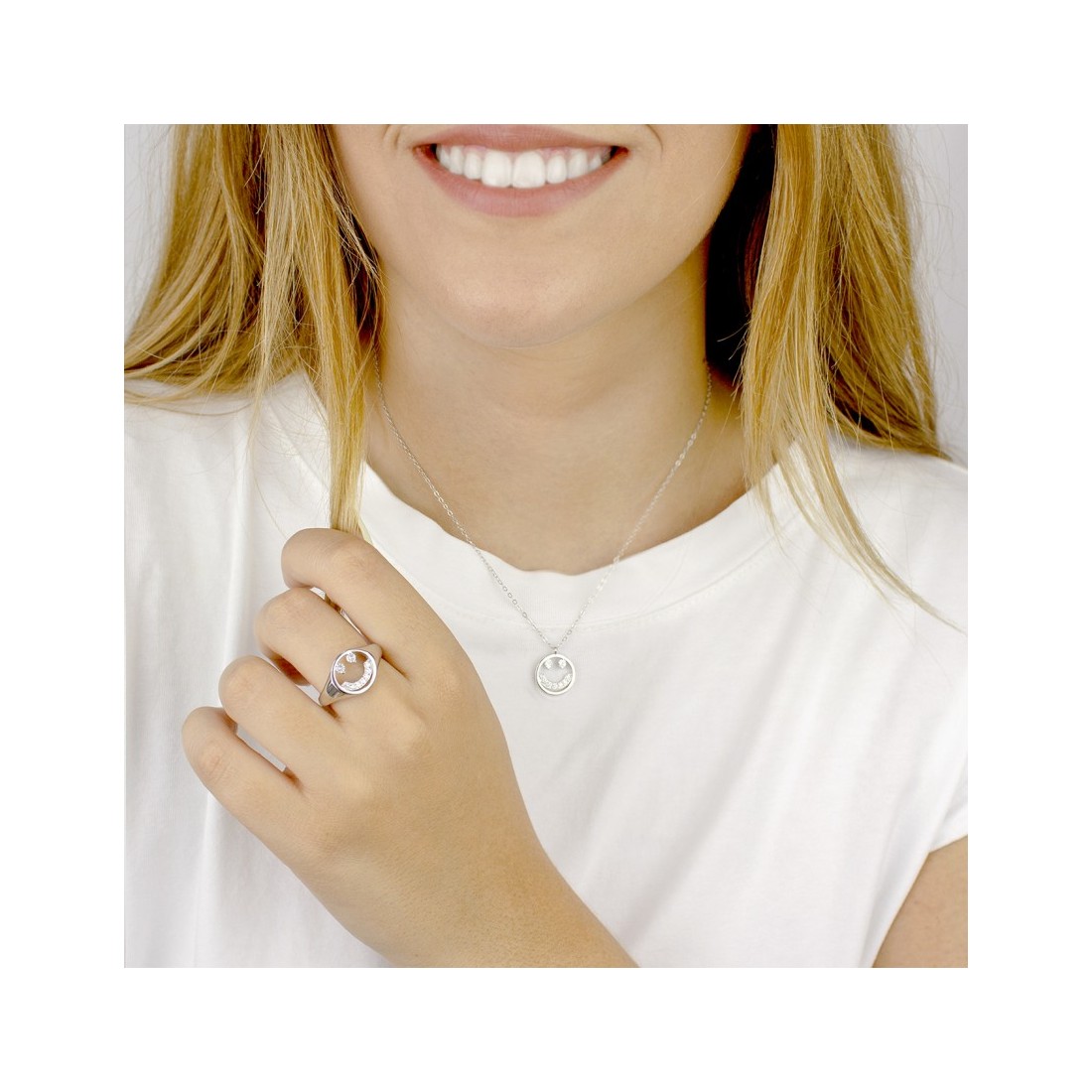 Sortija de Plata de Ley con motivo smiley o carita sonriente de 12 mm de diámetro y circonitas blancas.Sortija ajustable, no necesita talla.Incluye caja.