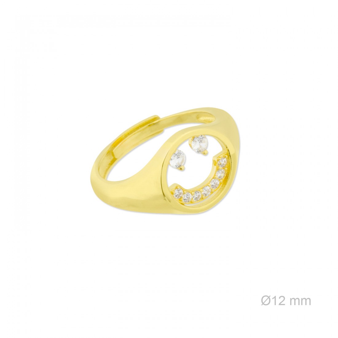 Sortija de Plata de Ley chapada en oro con motivo smiley o carita sonriente de 12 mm de diámetro y circonitas blancas.