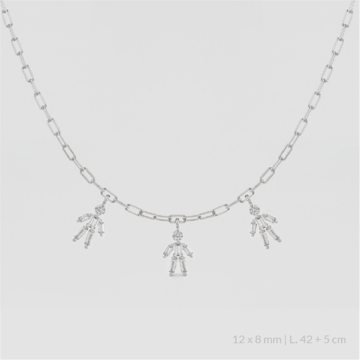 Gargantilla de Plata de Ley con tres niños de circonitas. Delicados diseños de niños donde cada pieza brilla como una pequeña estrella, convirtiéndose en un símbolo de amor eterno, pensada quienes desean llevar siempre cerca lo más valioso de su vida.