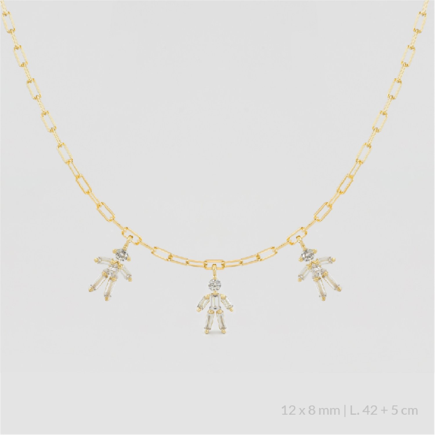 Gargantilla de Plata de Ley chapada en oro con tres niñas y un niño de circonitas. Delicados diseños de niños donde cada pieza brilla como una pequeña estrella, convirtiéndose en un símbolo de amor eterno, pensada quienes desean llevar siempre cerca lo más valioso de su vida.