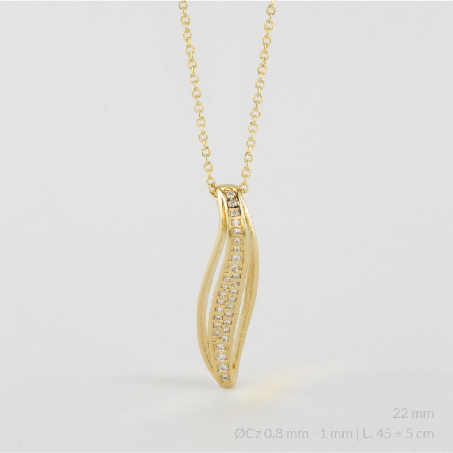 Destaca por su delicado diseño en forma de hoja con elegantes contrastes entre circonita y superficies lisas.