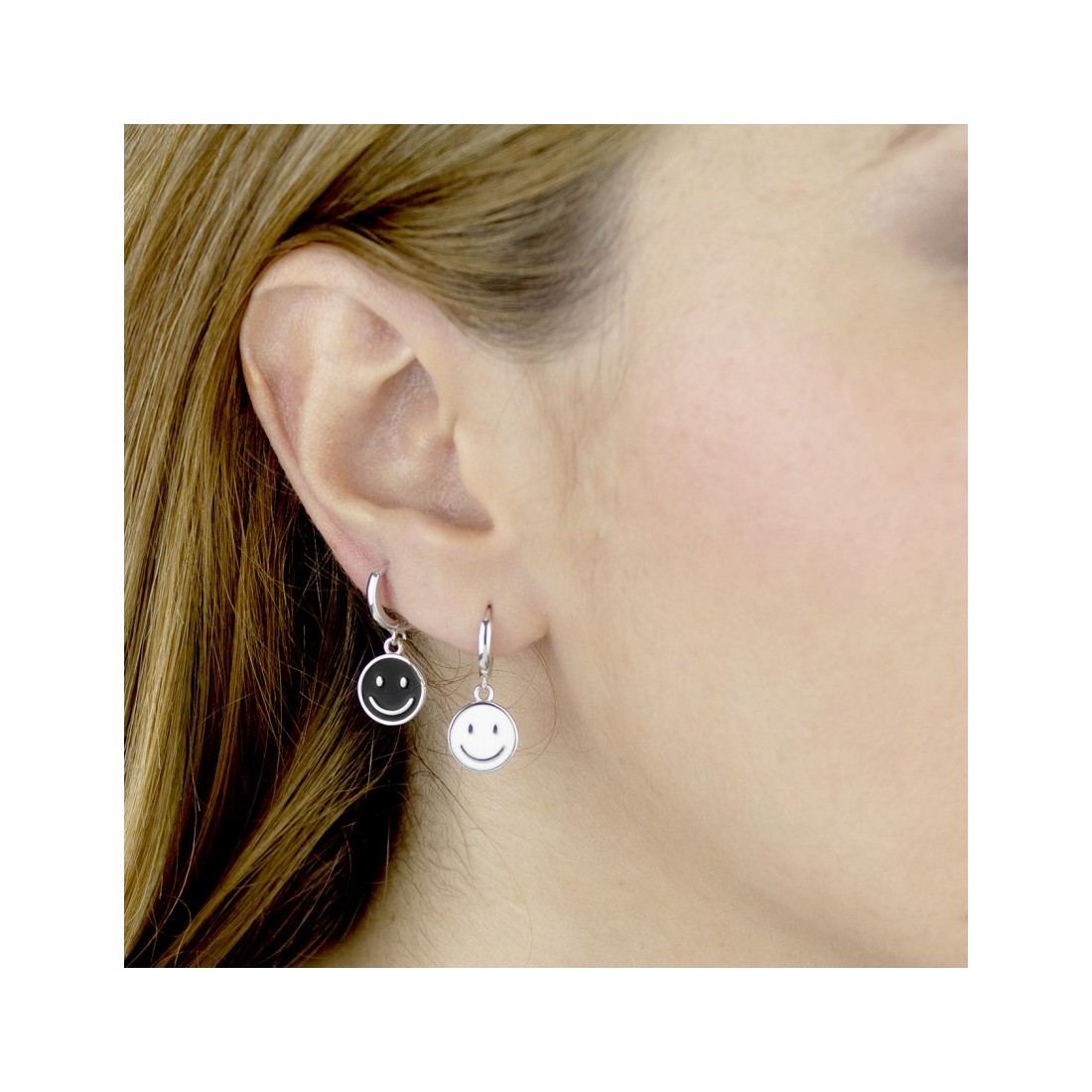 Aros de Plata de Ley de 10 mm con motivo smiley o carita sonriente de 10 mm de diámetro y esmalte blanco.