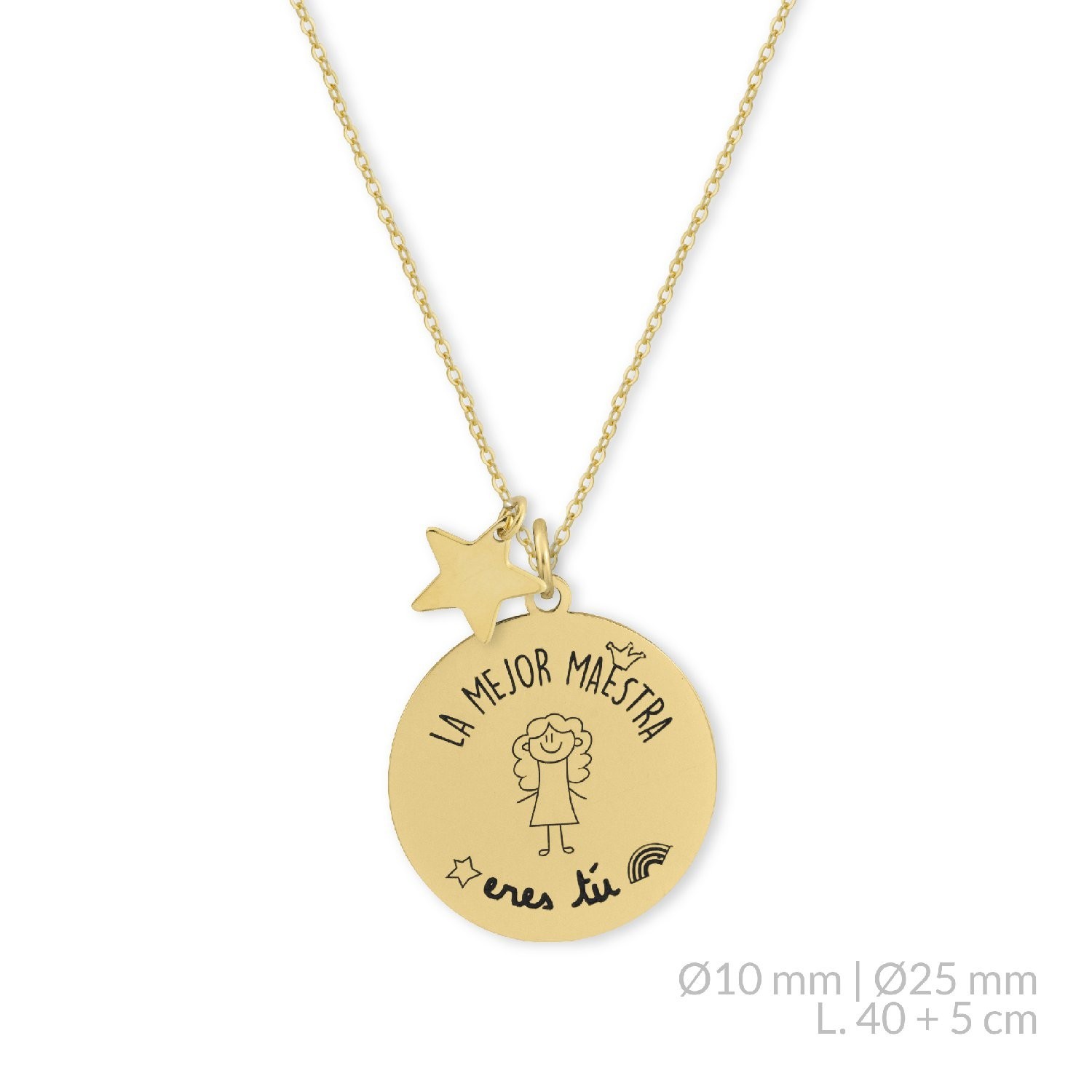 Gargantilla de Plata de Ley chapado en oro y plaquita con forma de estrella de Ø10mm. La placa está preparada para que la joyería pueda grabar pequeños textos como el curso, el año escolar, una fecha o el nombre de la clase.