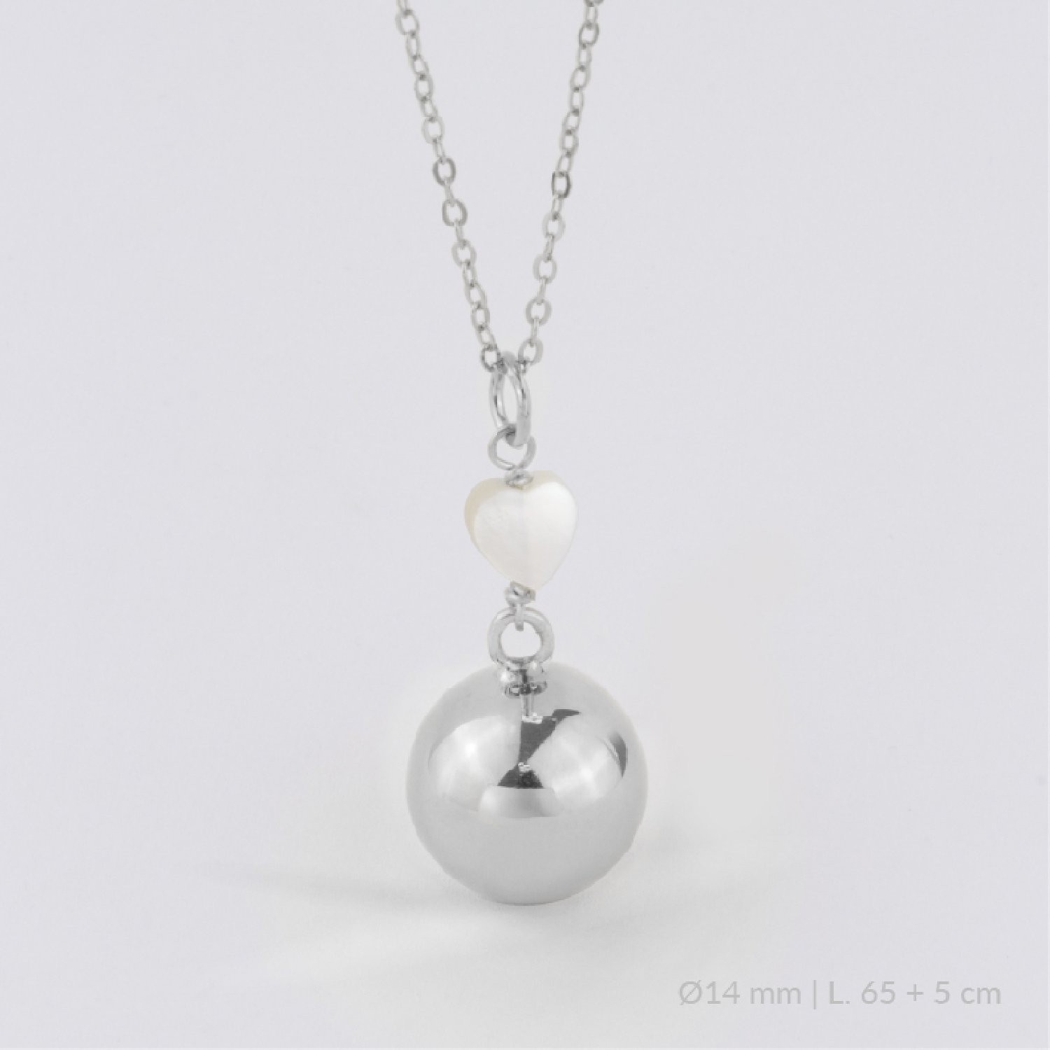 Llamador de ángel de Plata de Ley y entrepieza de nácar con forma de corazón. El llamador de ángel ayuda a calmar al bebé y a crear un vínculo muy especial entre él y la futura mamá. Se lleva a partir del cuarto mes, cuando el bebé desarrolla su audición y podrá escuchar la melodía del llamador. Es un símbolo de protección y calma.