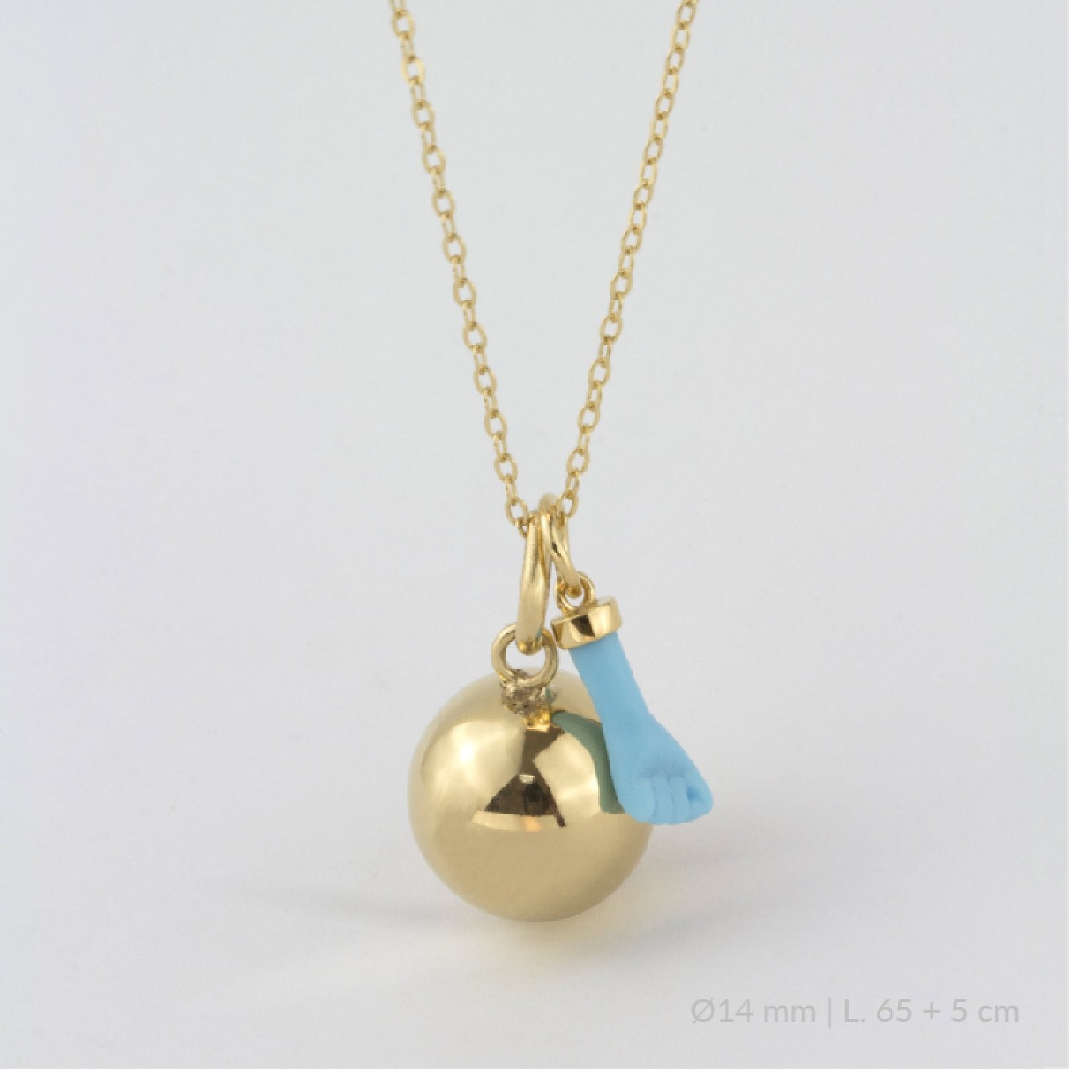 Llamador de ángel de Plata de Ley chapado en oro con higa turquesa. El llamador de ángel ayuda a calmar al bebé y a crear un vínculo muy especial entre él y la futura mamá. Se lleva a partir del cuarto mes, cuando el bebé desarrolla su audición y podrá escuchar la melodía del llamador. Es un símbolo de protección, calma y previene el mal de ojo.