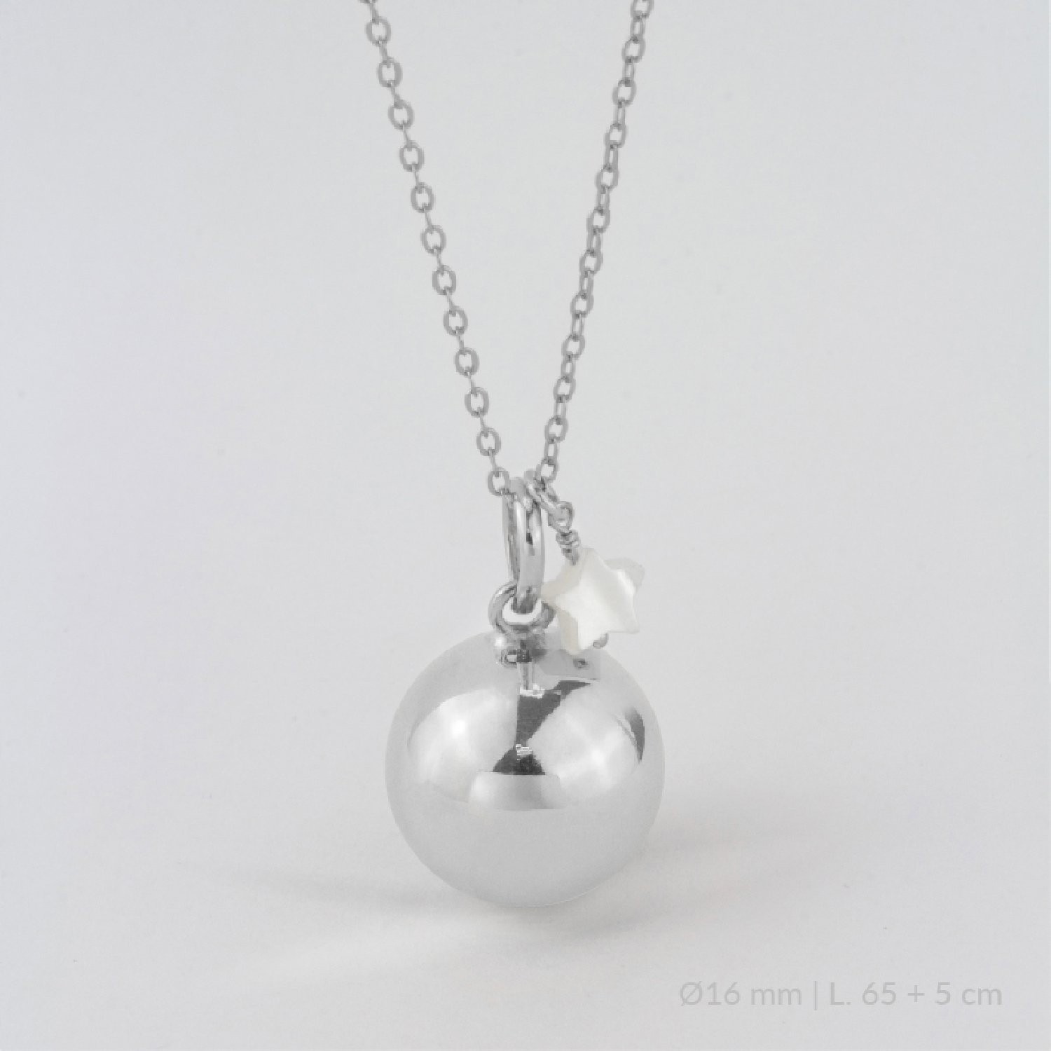 Llamador de ángel de Plata de Ley y charm con estrellita de nácar. El llamador de ángel ayuda a calmar al bebé y a crear un vínculo muy especial entre él y la futura mamá. Se lleva a partir del cuarto mes, cuando el bebé desarrolla su audición y podrá escuchar la melodía del llamador. Es un símbolo de protección y calma.