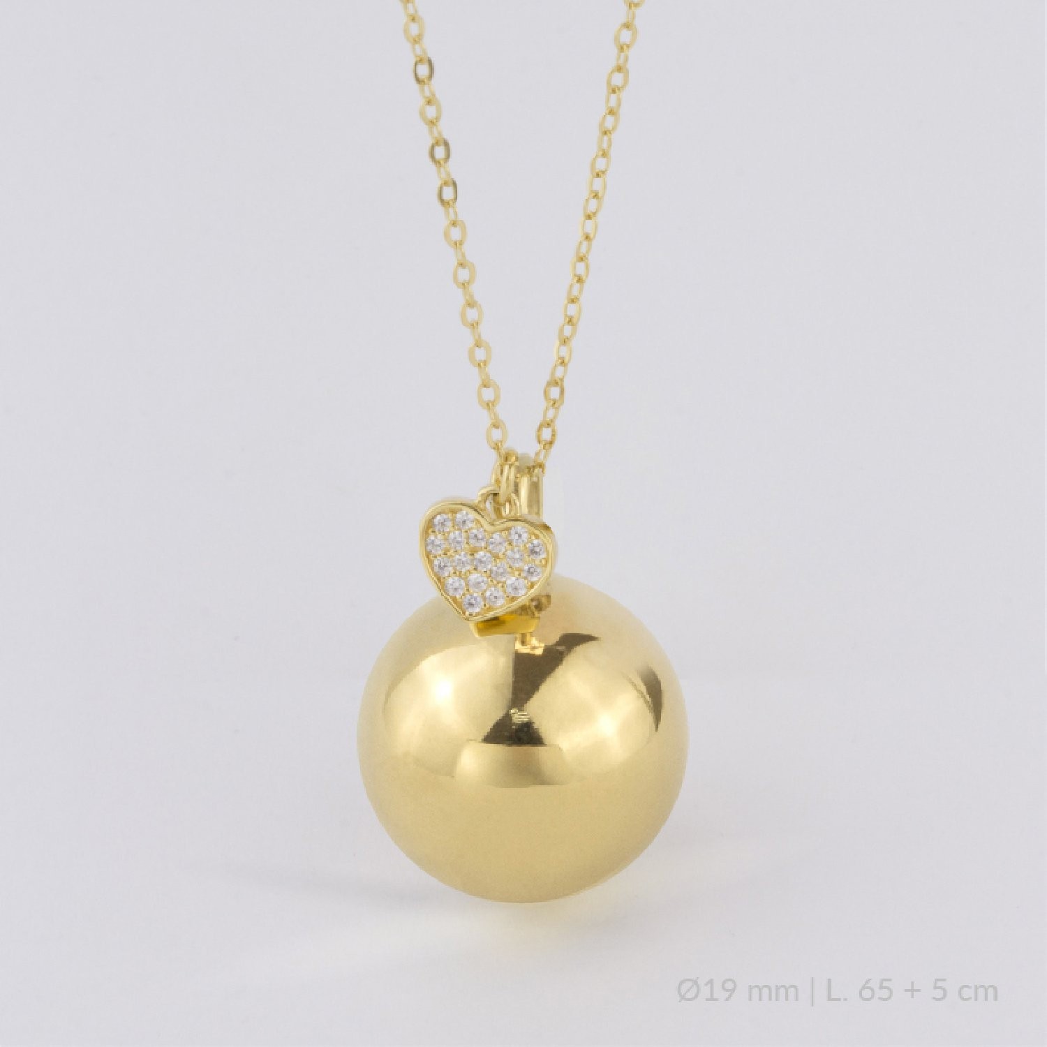 Llamador de ángel de Plata de Ley chapado en oro y charm con forma de corazón con circonitas. El llamador de ángel ayuda a calmar al bebé y a crear un vínculo muy especial entre él y la futura mamá. Se lleva a partir del cuarto mes, cuando el bebé desarrolla su audición y podrá escuchar la melodía del llamador. Es un símbolo de protección y calma.