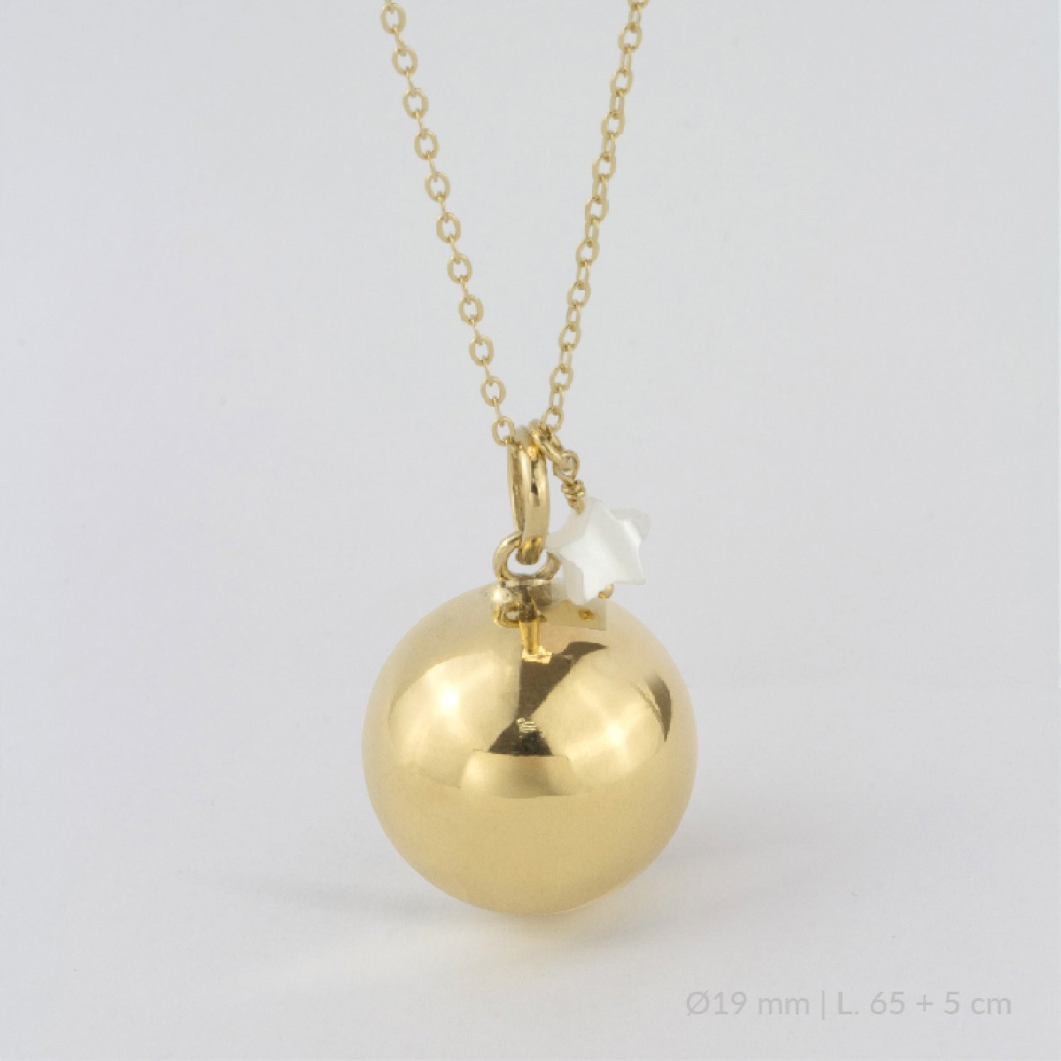 Llamador de ángel de Plata de Ley chapado en oro y charm con estrellita de nácar. El llamador de ángel ayuda a calmar al bebé y a crear un vínculo muy especial entre él y la futura mamá. Se lleva a partir del cuarto mes, cuando el bebé desarrolla su audición y podrá escuchar la melodía del llamador. Es un símbolo de protección y calma.