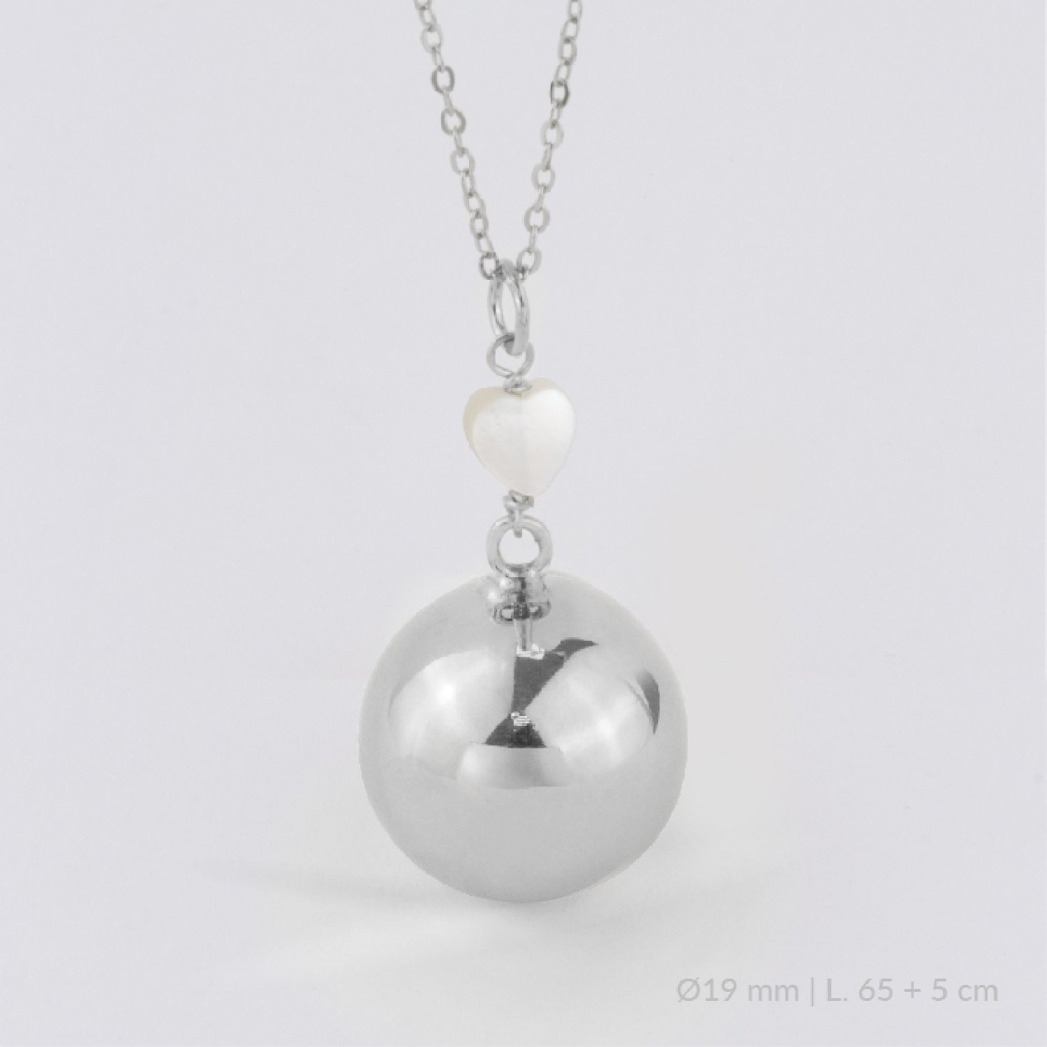 Llamador de ángel de Plata de Ley y entrepieza de nácar con forma de corazón. El llamador de ángel ayuda a calmar al bebé y a crear un vínculo muy especial entre él y la futura mamá. Se lleva a partir del cuarto mes, cuando el bebé desarrolla su audición y podrá escuchar la melodía del llamador. Es un símbolo de protección y calma.