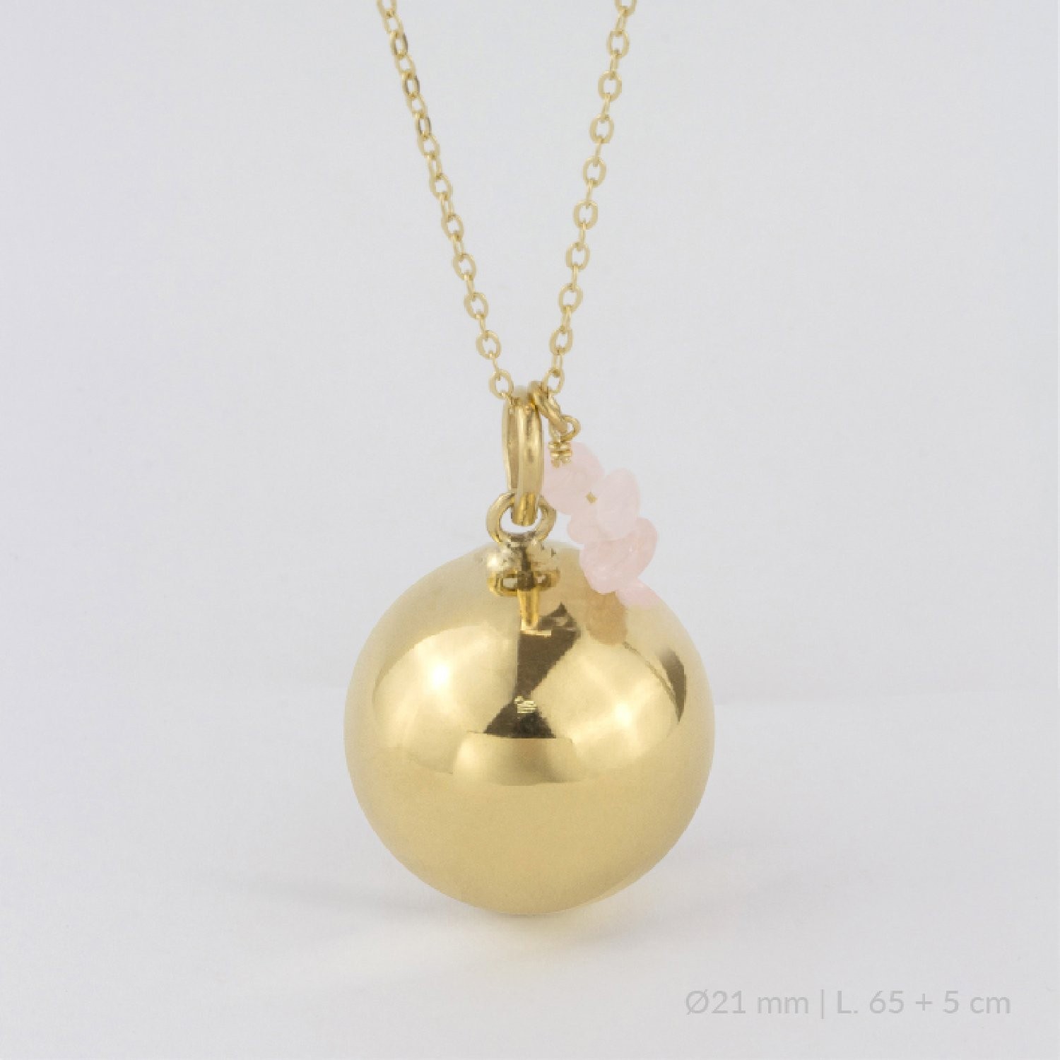 Llamador de ángel de Plata de Ley chapado en oro y charm con pequeños cuarzos rosas. El llamador de ángel ayuda a calmar al bebé y a crear un vínculo muy especial entre él y la futura mamá. Se lleva a partir del cuarto mes, cuando el bebé desarrolla su audición y podrá escuchar la melodía del llamador. Es un símbolo de protección y calma.