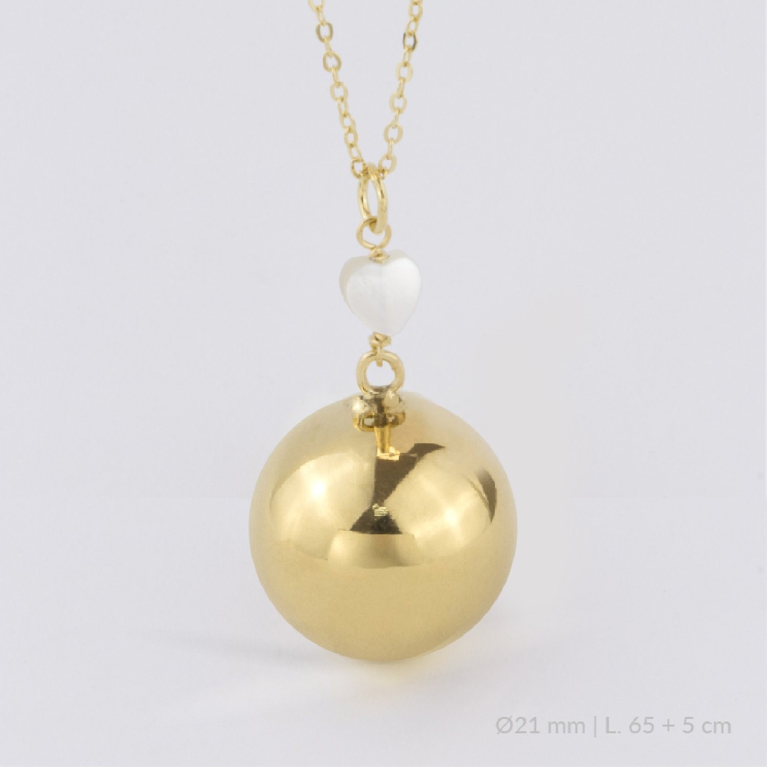 Llamador de ángel de Plata de Ley chapado en oro y entrepieza de nácar con forma de corazón. El llamador de ángel ayuda a calmar al bebé y a crear un vínculo muy especial entre él y la futura mamá. Se lleva a partir del cuarto mes, cuando el bebé desarrolla su audición y podrá escuchar la melodía del llamador. Es un símbolo de protección y calma.