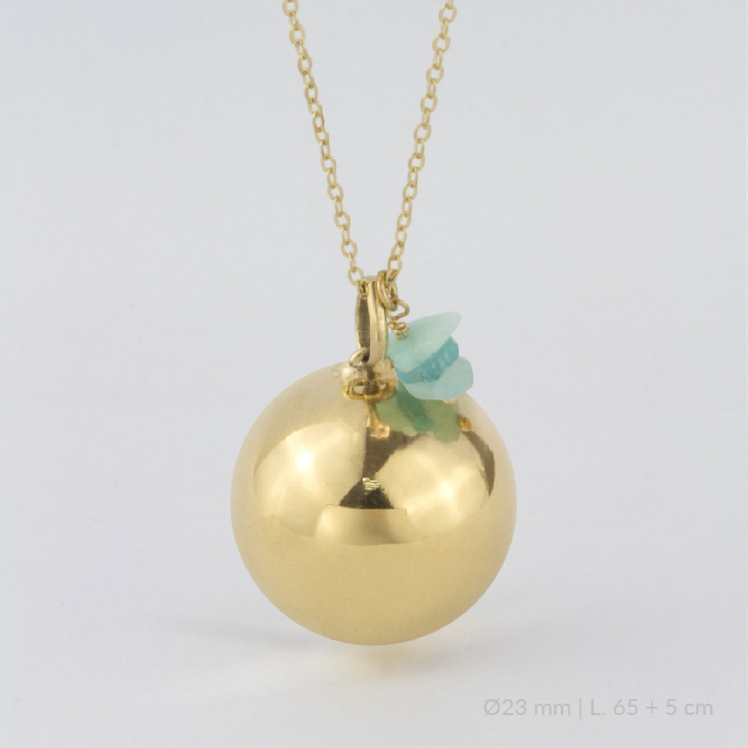 Llamador de ángel de Plata de Ley chapado en oro y charm con pequeñas piedras de aguamarina. El llamador de ángel ayuda a calmar al bebé y a crear un vínculo muy especial entre él y la futura mamá. Se lleva a partir del cuarto mes, cuando el bebé desarrolla su audición y podrá escuchar la melodía del llamador. Es un símbolo de protección y calma.