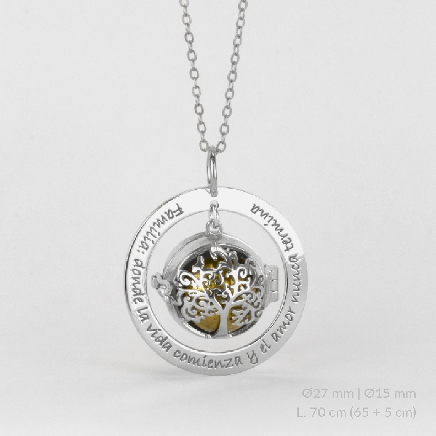 El llamador de ángel ayuda a calmar al bebé y a crear un vínculo muy especial entre él y la futura mamá. Hemos querido añadir el árbol de la vida a esta joya, un símbolo muy poderoso. Representa a la familia, la fuerza de sus vínculos y la esperanza de un futuro radiante y bondadoso.