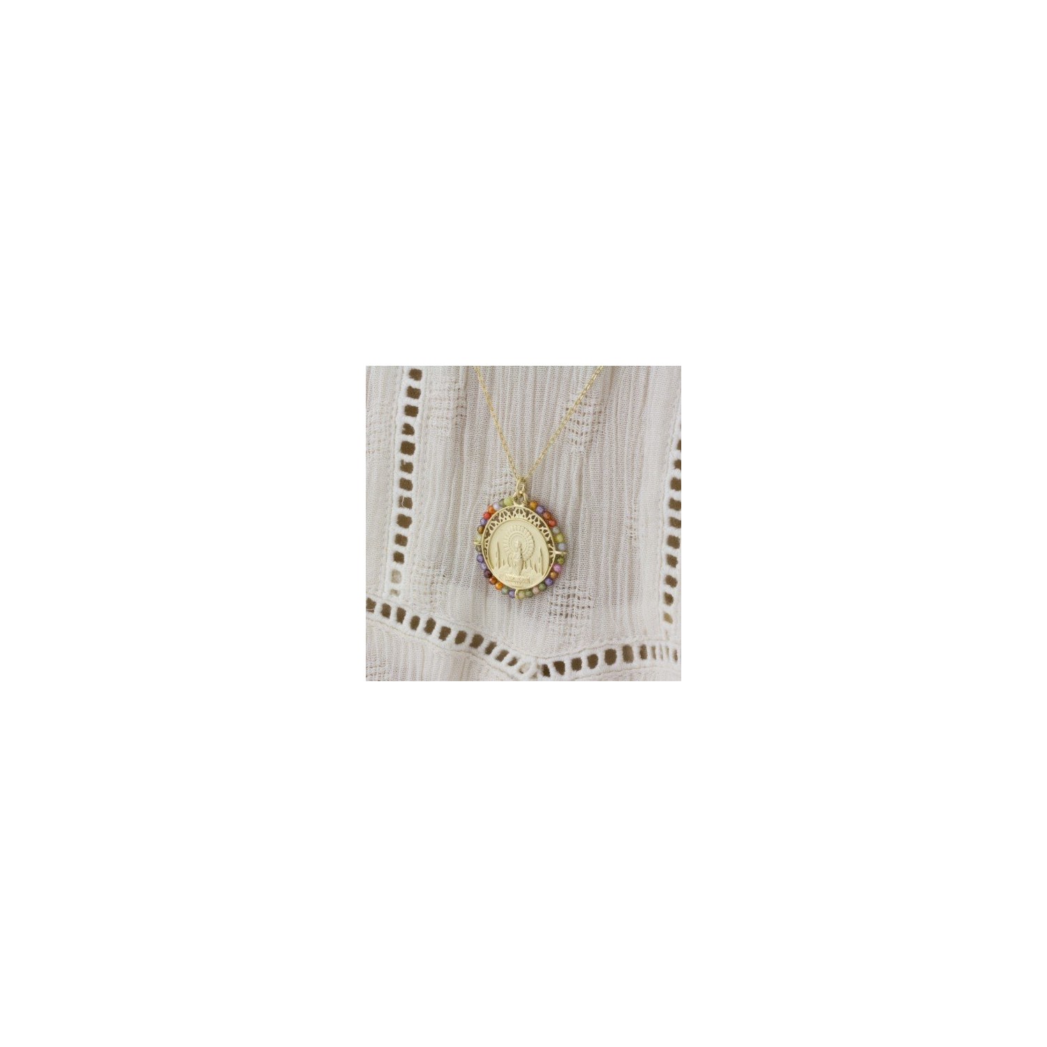 Delicada medalla cuya rocalla de colores simboliza el manto de flores que cubre su pie durante la Ofrenda de Flores de las Fiestas del Pilar. En el anverso podemos ver un exquisito relieve de la virgen con un acabado pulido que contrasta con el fondo mate arenado, aportando un contraste que resalta la imagen. En el reverso, tenemos en bajorelieve el texto "Virgen del Pilar. Ruega por nosotros".