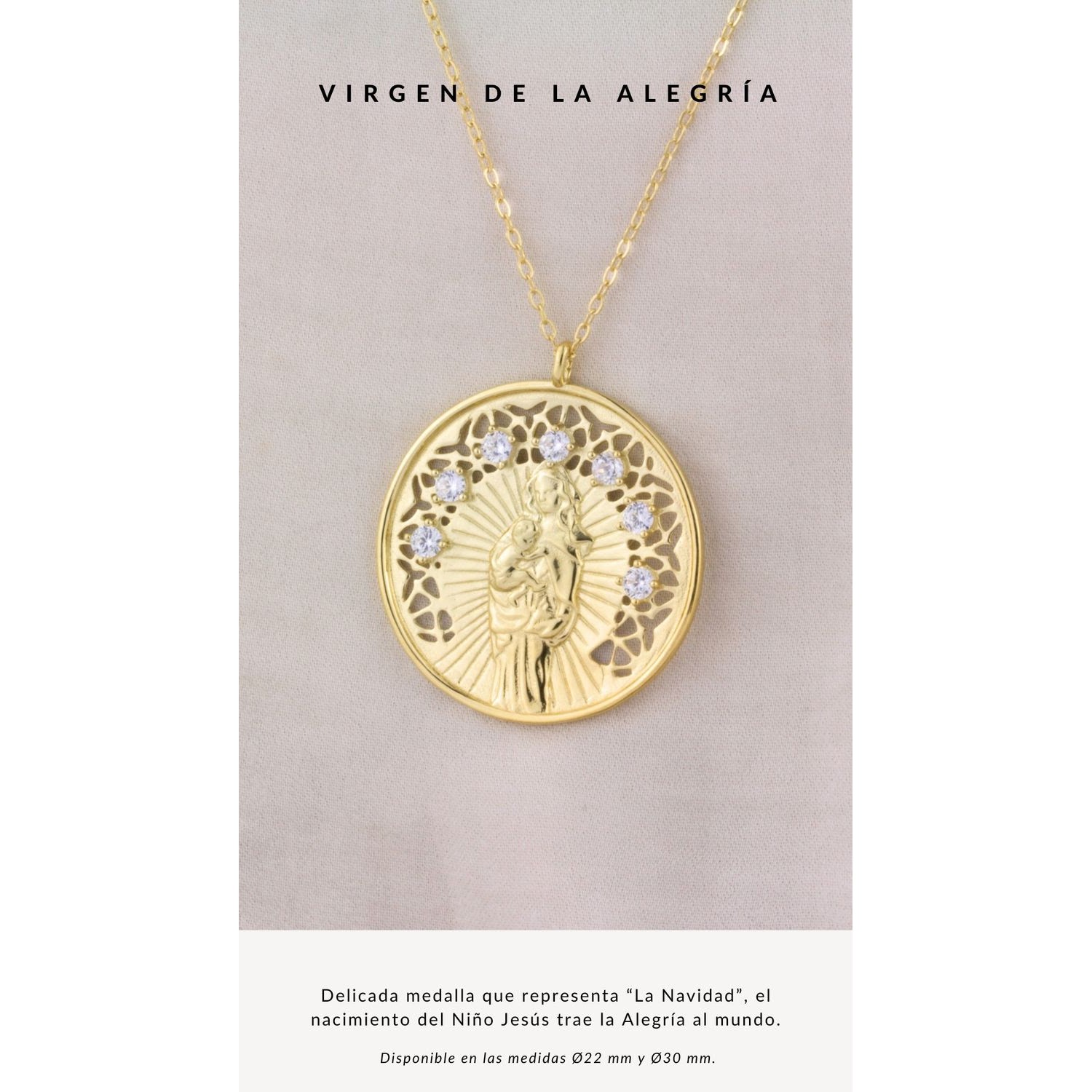 Medalla de Plata de Ley chapada en oro de la Virgen de la Alegría con circonitas.