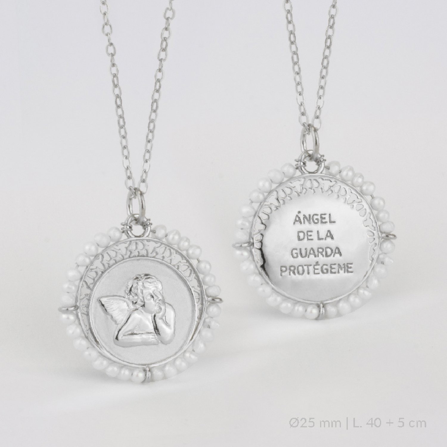 Medalla de Plata de Ley del ángel de la Guarda con perla cultivada.