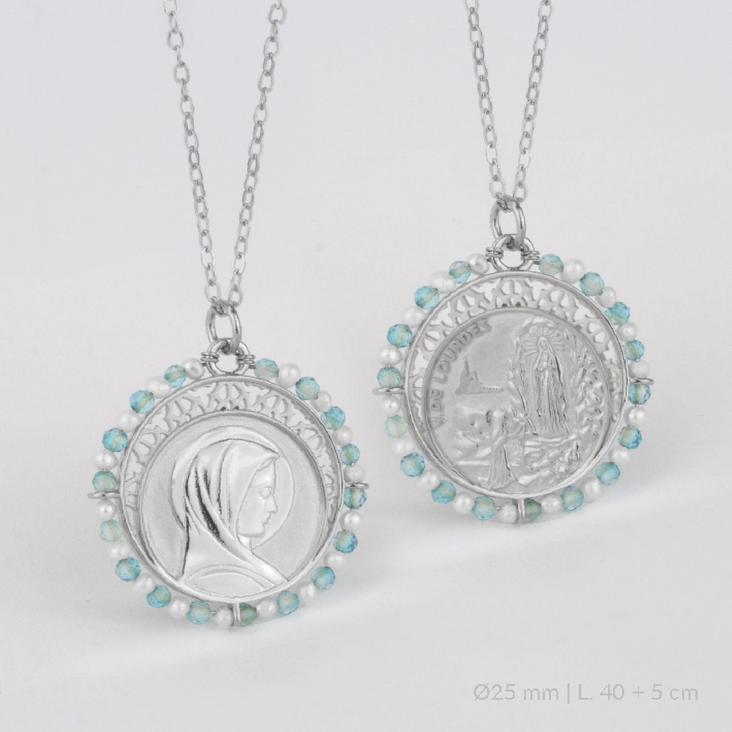 Medalla de Plata de Ley de la Virgen de Lourdes con perla cultivada y rocalla aguamarina.
