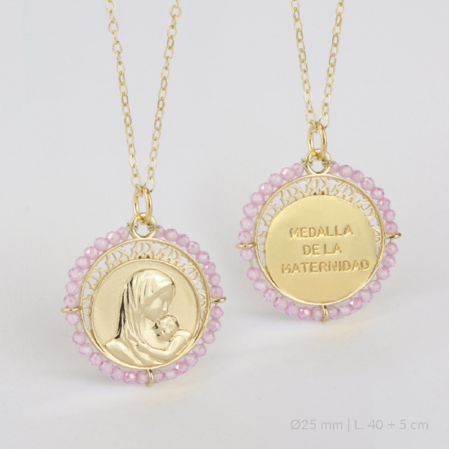 Medalla de Plata de Ley de la Maternidad con rocalla de cuarzo rosa.