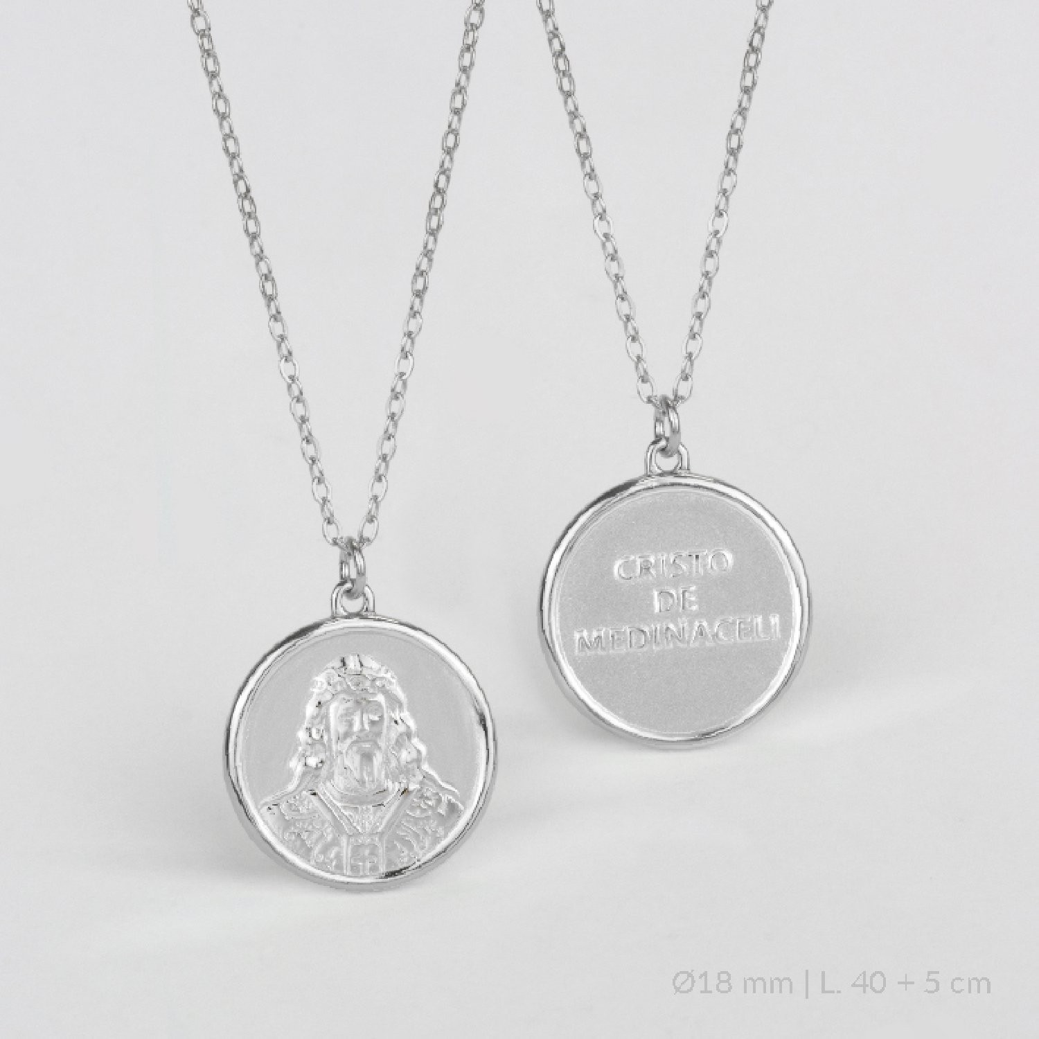 En el anverso podemos ver un exquisito relieve del Cristo de Medinaceli con un acabado pulido que contrasta con el fondo mate arenado, aportando un contraste que resalta la imagen. En el reverso, tenemos en bajorelieve el texto "Cristo de Medinaceli". Delicada medalla que representa a Jesús de Nazaret y evoca el momento de su Pasión cuando Pilato lo presenta al pueblo: Ecce, homo (Ahí, tenéis al hombre).