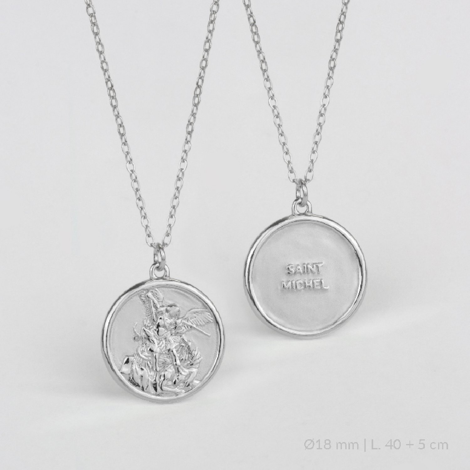 En el anverso podemos ver un exquisito relieve del arcangel representado como un guerrero con escudo y espada, con un acabado pulido que contrasta con el fondo mate arenado, aportando un contraste que resalta la imagen. En el reverso, tenemos en bajorelieve el texto "saint Michel". Delicada medalla que representa San Miguel defendiend al pueblo y luchando contra el demonio y los ángeles caídos.Protege a todo aquel que esté luchando y resistiéndose a las tentaciones y los pecados.