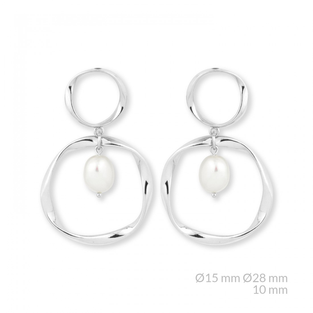 Aros de Plata de Ley de 15 mm y 28 mm de diámetro con efecto ondulado y perla cultivada de 10 mm de alto.