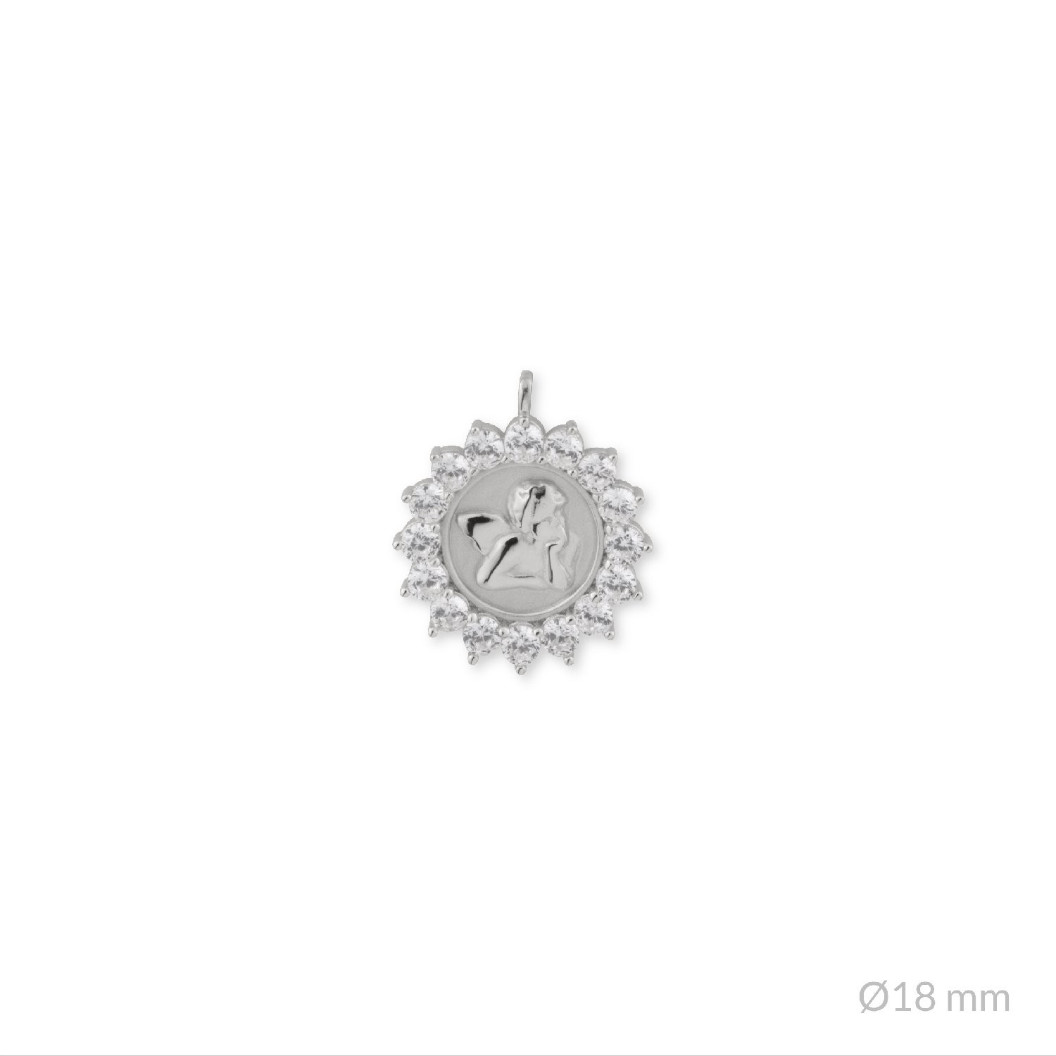 Tamaño de la medalla: Ø18 mm. Tamaño de la circonita: Ø2.50 mm. Color de la circonita: Blanco calidad superior.